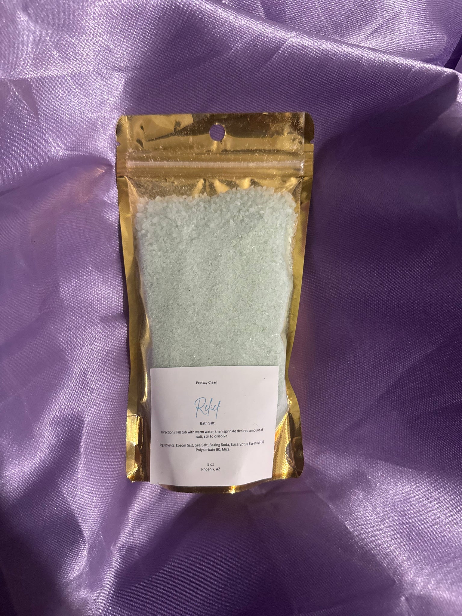 Ingredients: Epsom Salt, Sea Salt, Baking Soda, Eucalyptus Essential Oil, Polysorbate 80, Mica